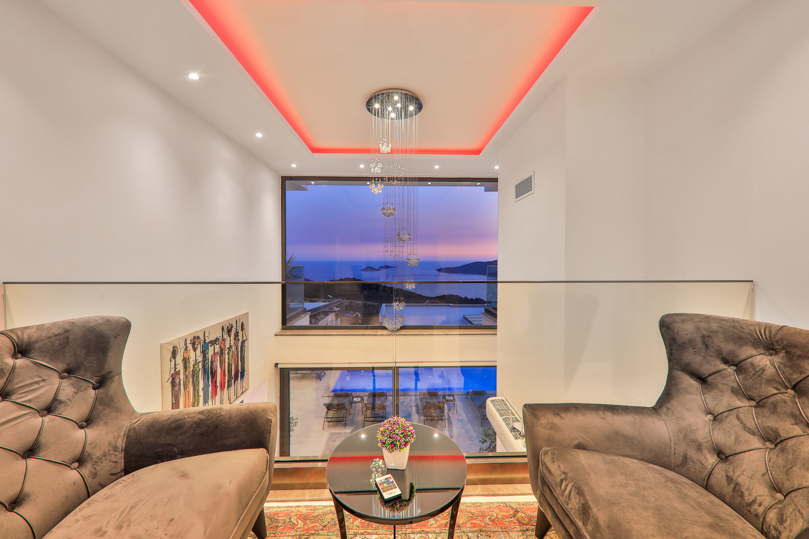 غرفة المعيشة: في الصالة المطلة على البحر ، يوجد مجموعة جلوس ، تلفزيون بلازما ، ريسيفر ستالايت ، مكيف ، طاولة قهوة ومخرج للمسبح.