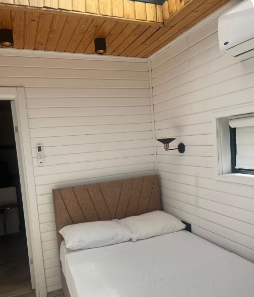 ▫ Bedroom: Comfortable double bed, air conditioning, and essential storage areas designed for a simple and relaxing sleeping space