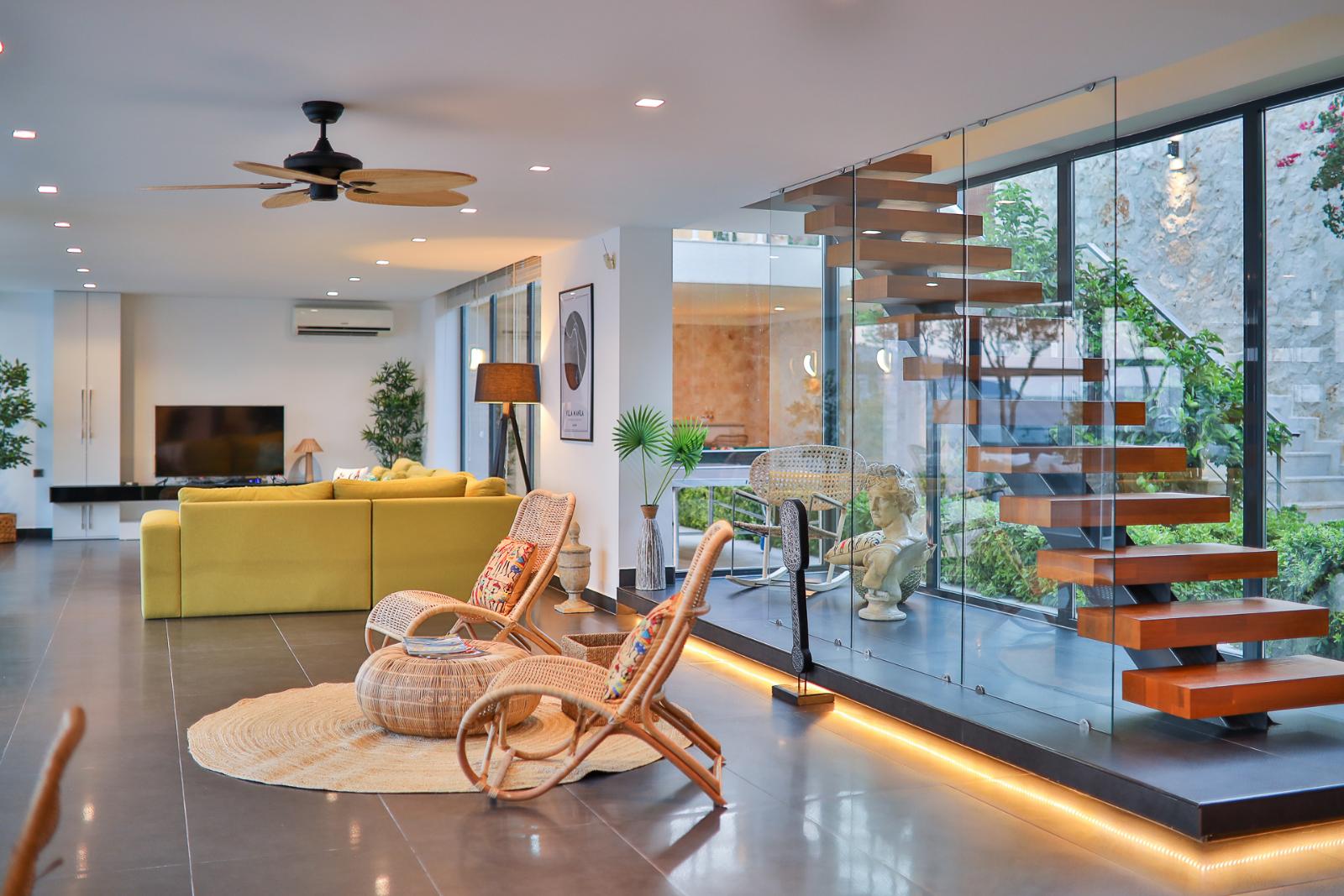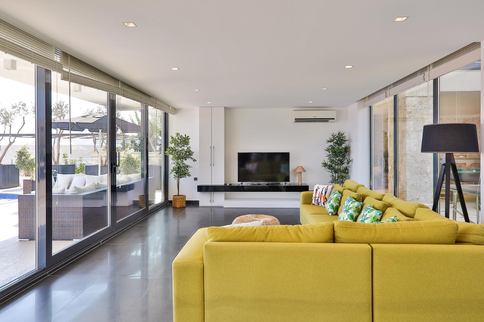 ✦ Spacious and stylish living area with comfortable seating, TV, and air conditioning