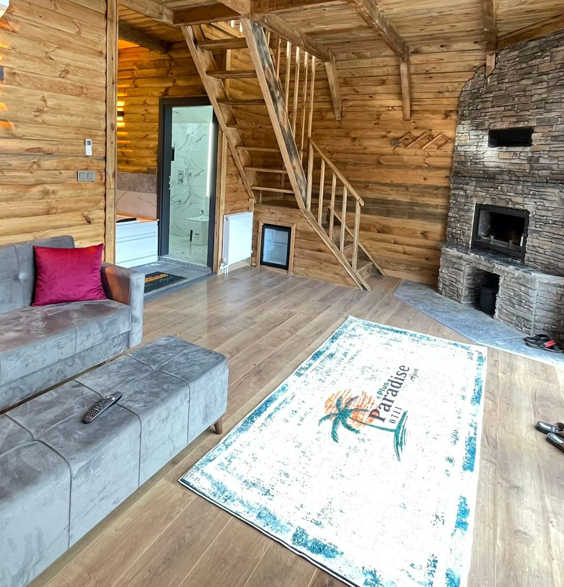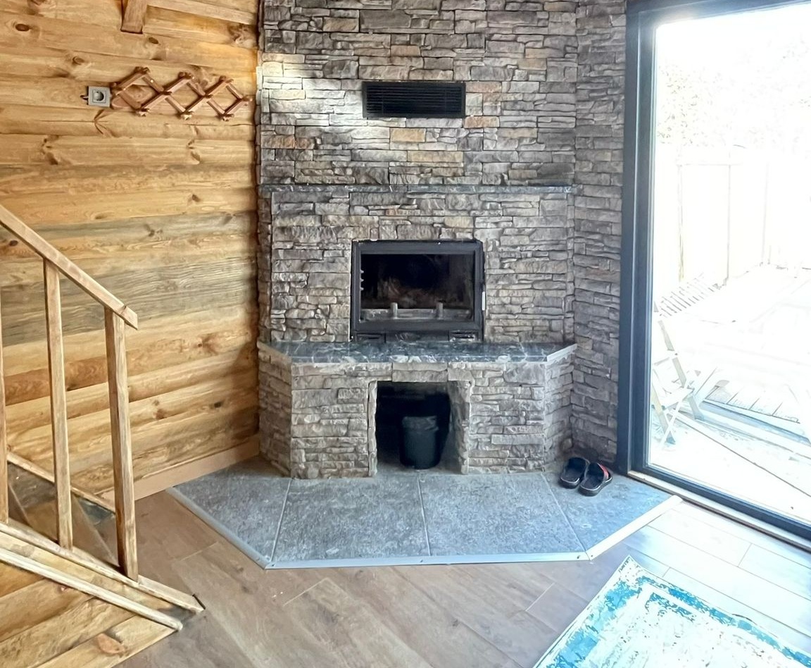 → Гостиная: удобный диван, телевизор, кондиционер, камин