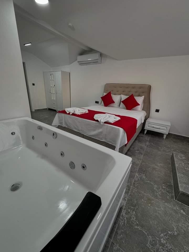 1. Yatak Odası: Bir adet çift kişilik yatak, komodin, elbise dolabı, klima, ebeveyn banyosu ve jakuzi bulunmaktadır.