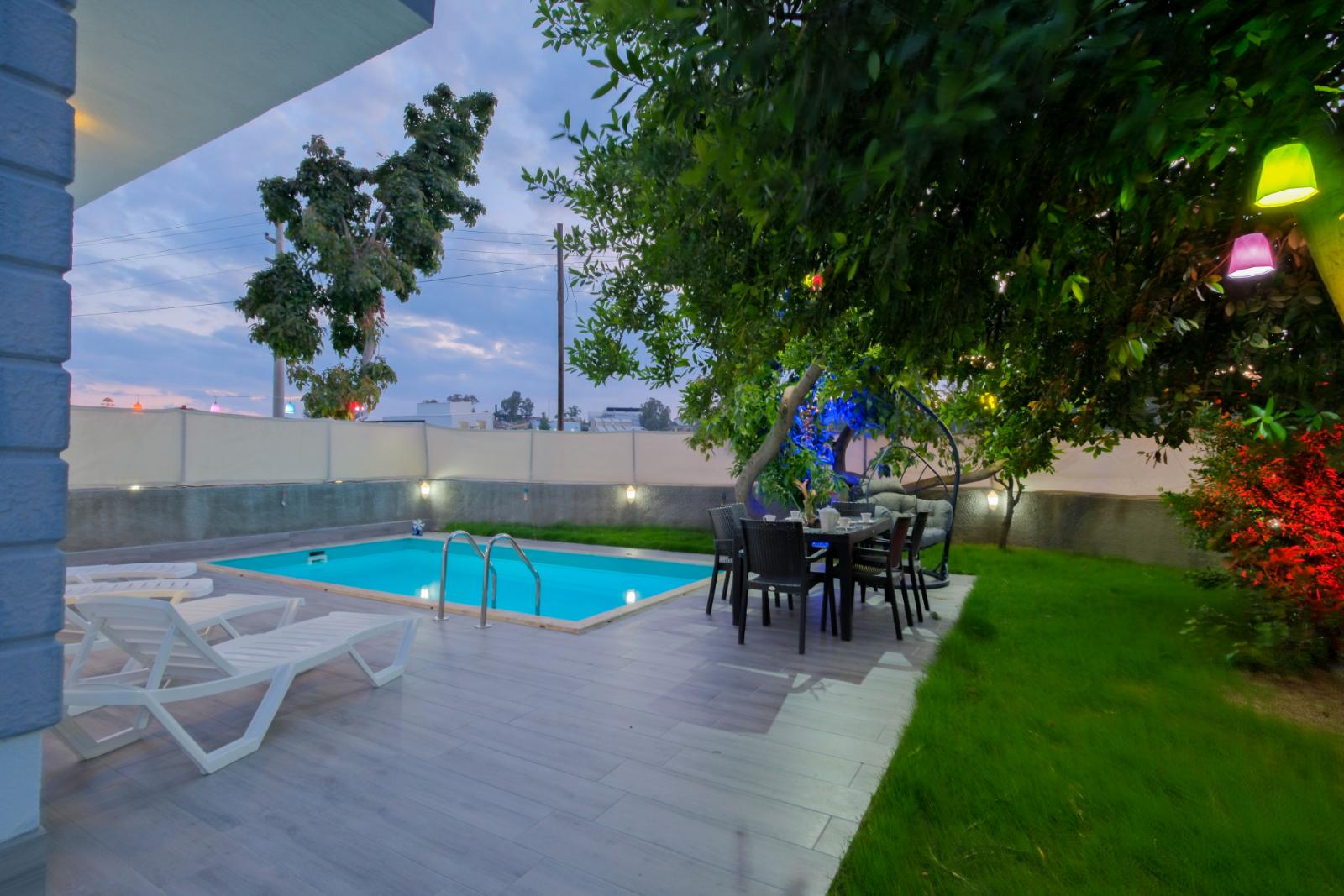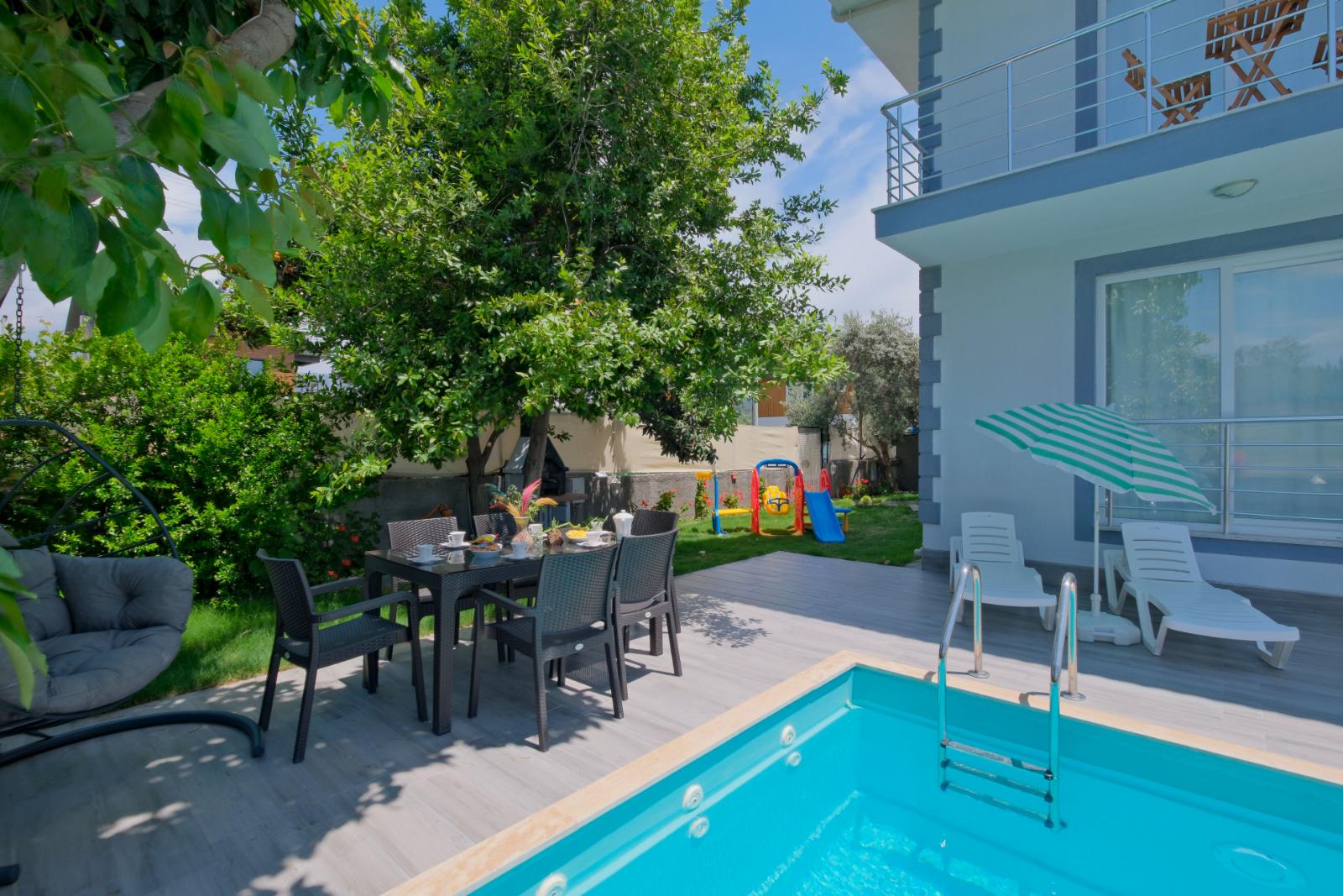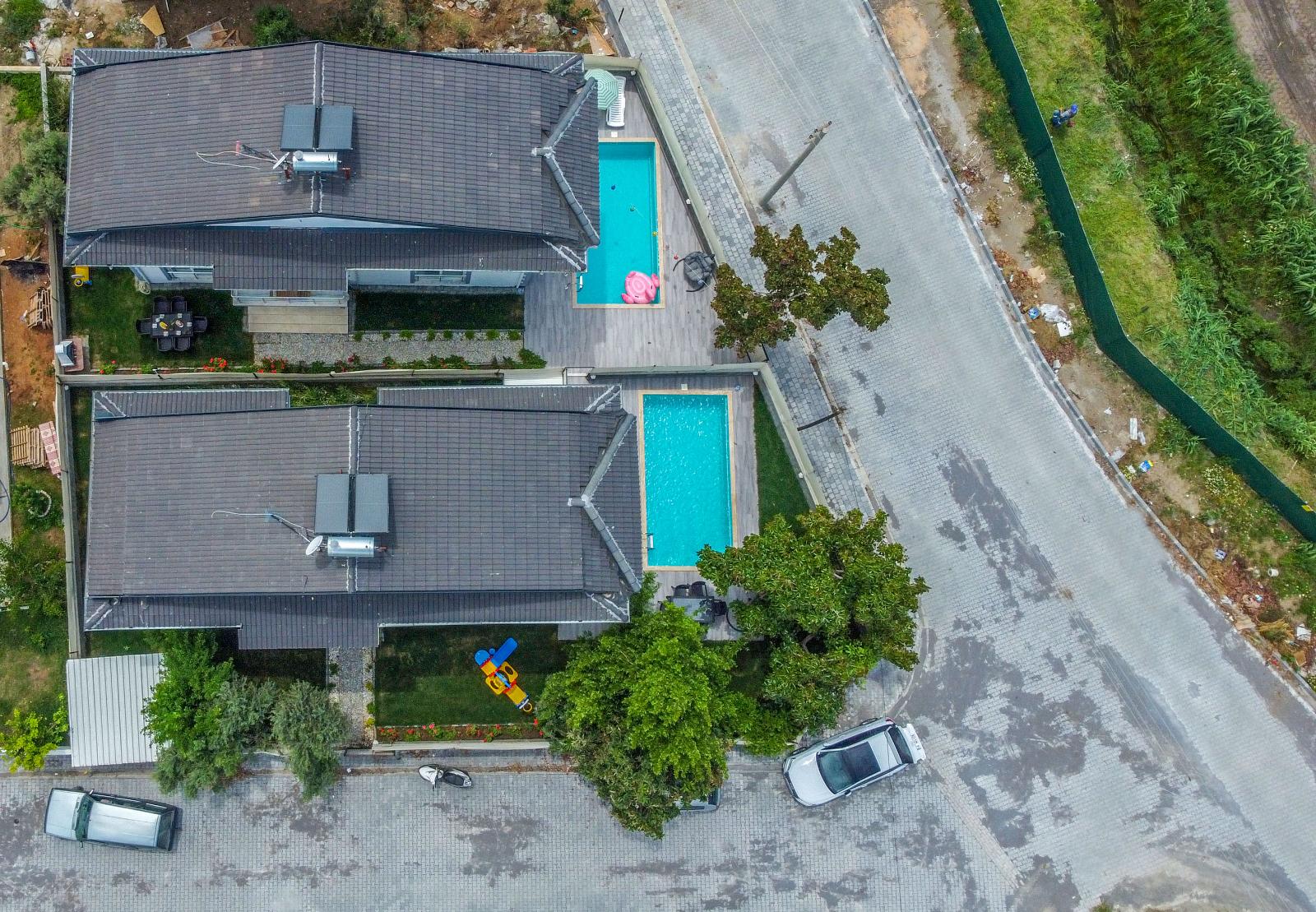✔ Havuz Keyfi – Özel havuz, mahremiyet sunarken dışarıdan kısmen görünür; 6 m x 3 m x 1,5 m ölçülerinde.