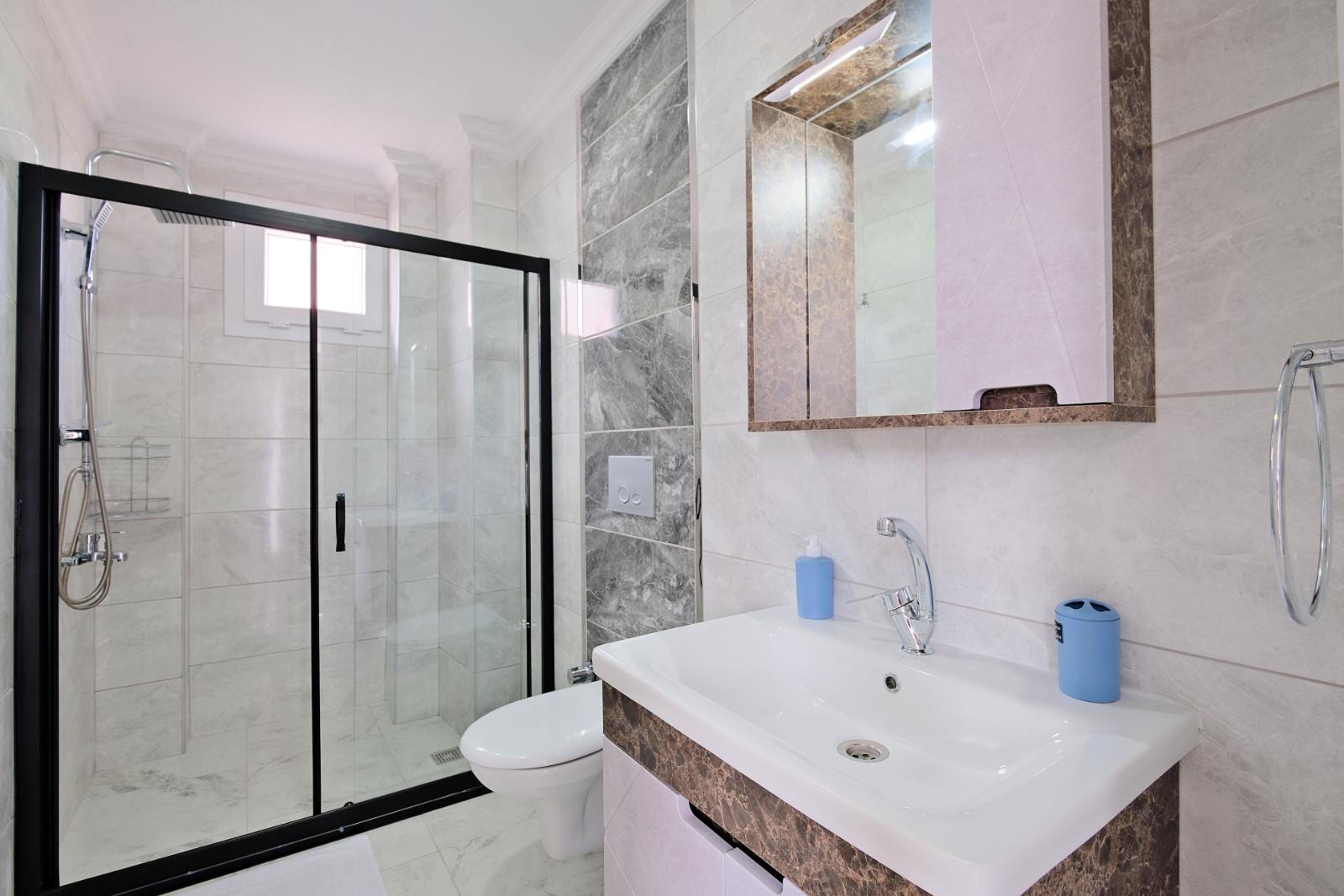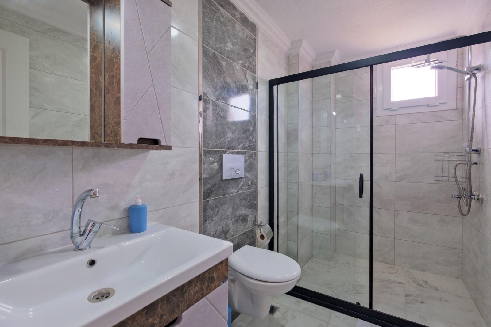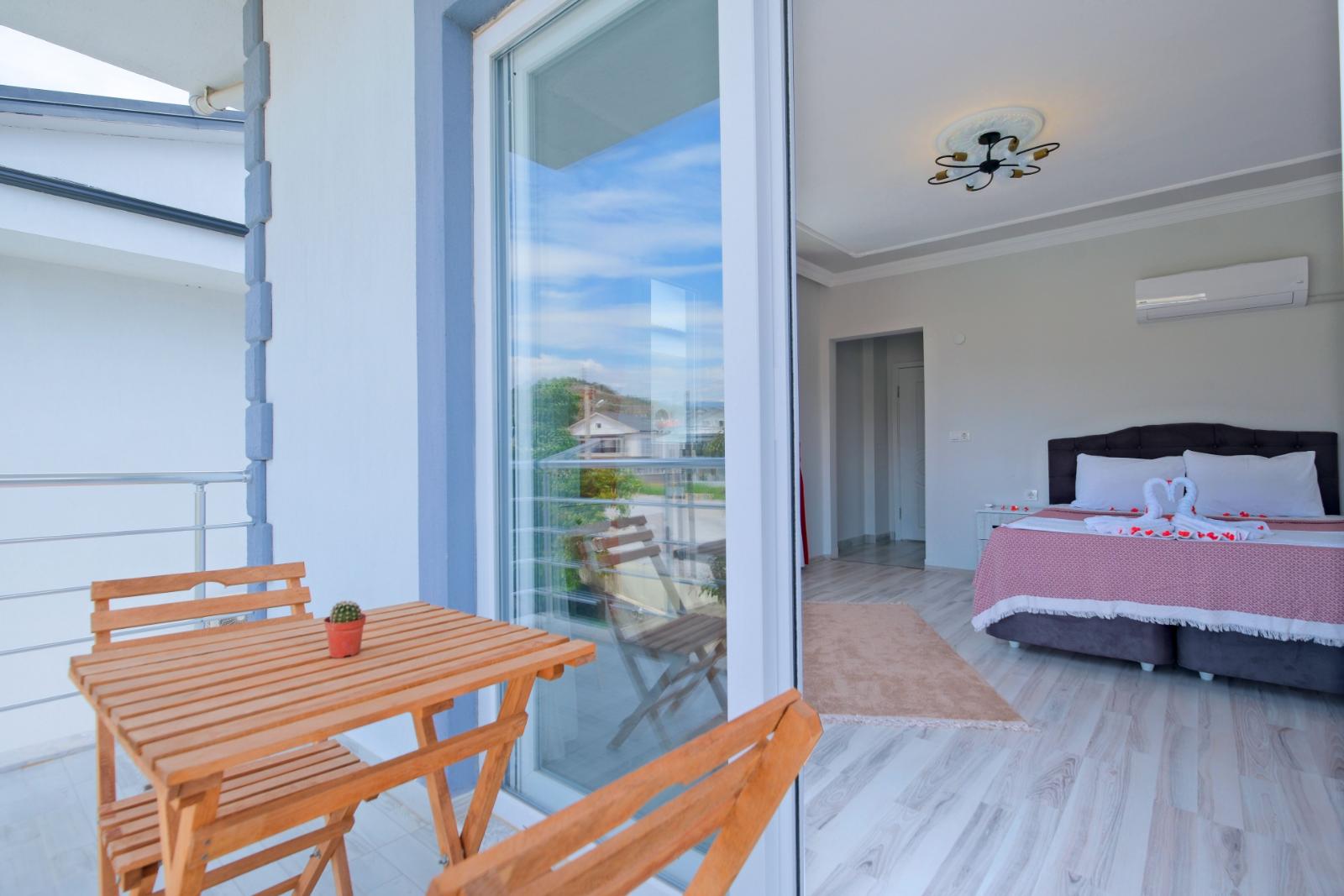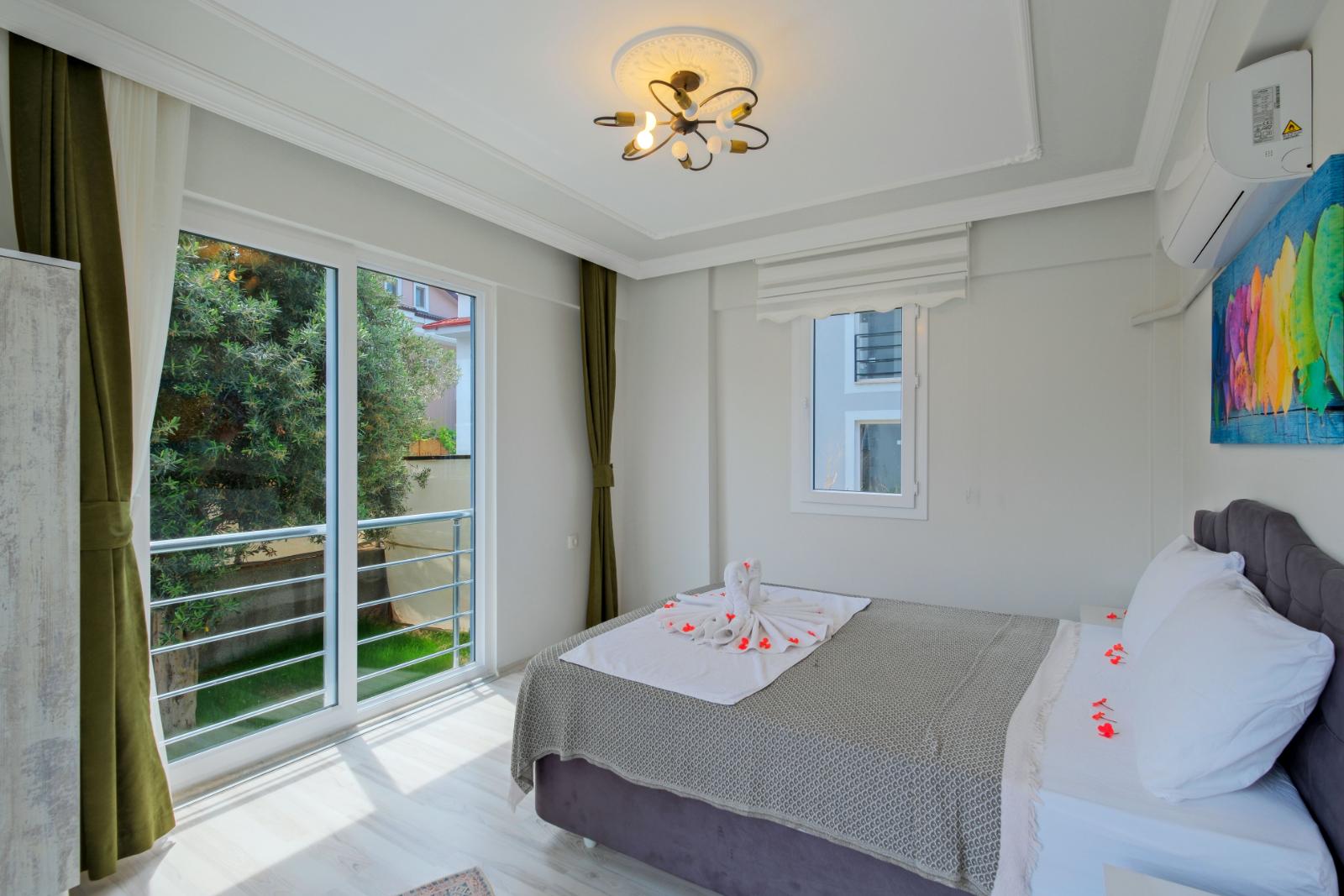 Yatak Odası 2: Çift kişilik yatak, klima, özel banyo ve WC