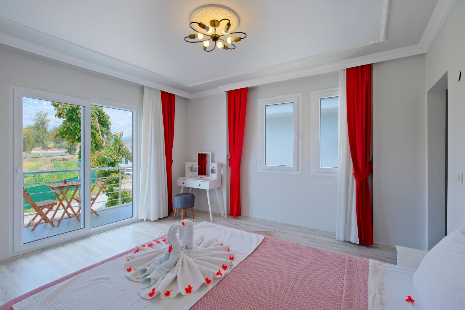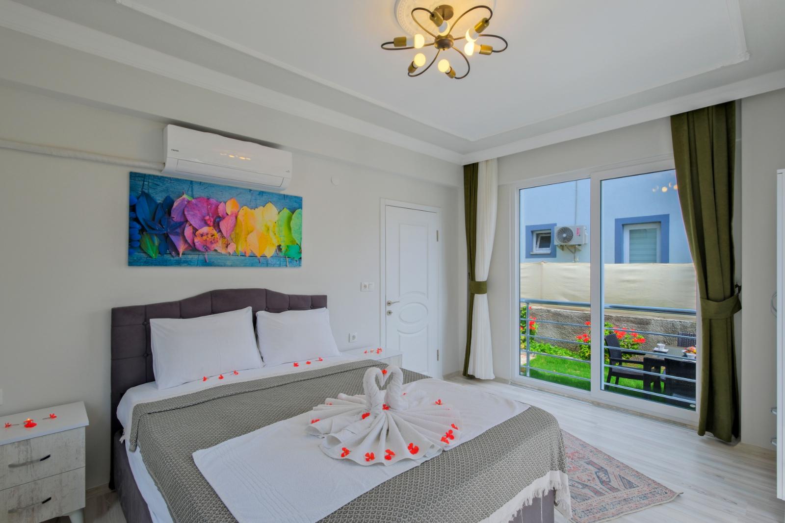 Yatak Odası 1: Çift kişilik yatak, klima, özel banyo ve WC